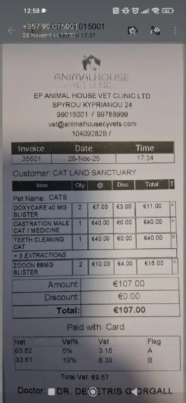 Хочу помочь компенсировать счет за кошку, на данный момент счет уже оплачен фостером(передержкой где живут кошки), имя на чеке удалено, так как кошка в клинике была записана на другого волонтера, который предоставил свой аккаунт для скидки, но не принимает непосредственно участие в судьбе кошки.