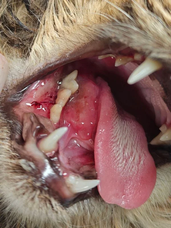 На момент поступления в клинику Плюша не могла нормально питаться, плакала во время еды, перестала ухаживать за собой, вся шерсть в колтунах, потому что ей больно даже умываться, сильно похудела, не проявляла никакой активности, кроме постоянного трения лапкой морды. Слюни и вонь изо рта. И вероятно, из-за боли она не давала подходить к себе близко.