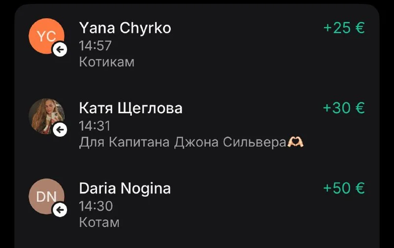 От Дарьи, Катерины, Яны, Катерины нам пришло 115 евро 😌😻🥰🥰🥰