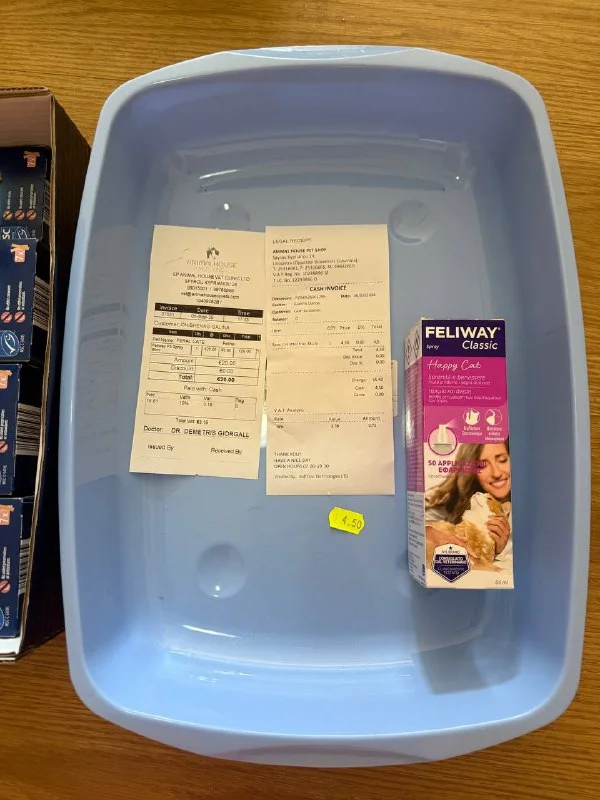 Маленький лоточек и феливей-спрей (24,5евро) (в котодомике, куда поедет малыш - нет розеток, нужен был именно спрей)