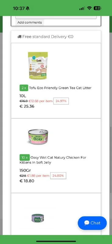 Так же оформлен заказ на сухой и влажный корм, наполнитель (на скринах) на общую сумму 98 евро