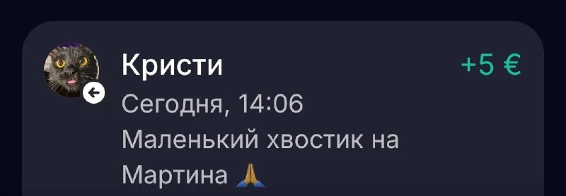 Сегодня Кристина прислала нам денюжку с такой милой подписью "Маленький хвостик для Мартина"! Такие простые слова, да? А чувствуется, что от всей души! Знаю, Кристина сама в долгах, как в шелках, но не пожалела пяти евро, которые ей самой нужны для ее хвостиков. И домашних, и тех, которых она спасает. Спасибо, дорогая!❤️