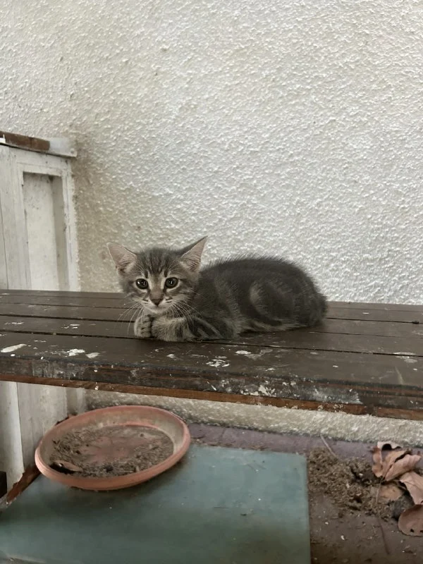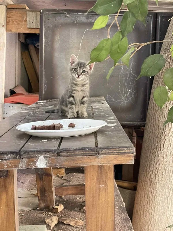 На улице вместе с мамой живёт удивительно красивый котенок с мраморной шерсткой. Мы думаем, что ему около 2 месяцев, но не знаем точно его пол — он еще немного дикий: шипит, если подойти близко, и старается убежать. Но это не агрессия, а страх. Он просто не знает, что такое забота и ласка.