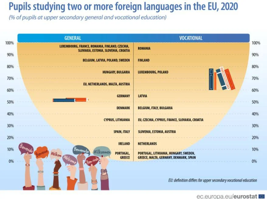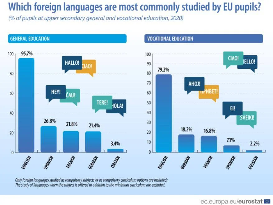 В целом по Евросоюзу тройка самых популярных иностранных языков выглядит следующим образом: английский (95,7%), испанский (26,8%) и французский (21,8%).