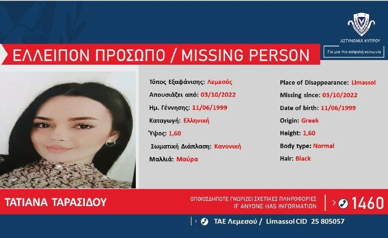 Полиция Республики Кипр обратилась к жителям страны с призывом помочь в поисках 23-летней гражданки Греции Татьяны Тарасиду. Ее видели в понедельник, 3 октября, по месту жительства в Лимассоле. С тех пор о ее местоположении нет никаких сведений.