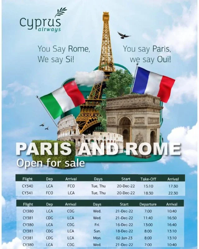 Авиакомпания Cyprus Airways в декабре открывает рейсы в Париж 🇫🇷 и Рим 🇮🇹.