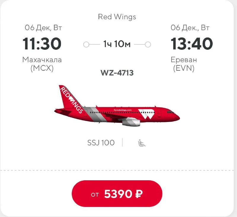 Авиакомпания Red Wings с 6 декабря и до 21 марта по вторникам запускает прямые рейсы между Махачкалой и Ереваном. Билеты от 85€ в одну сторону.