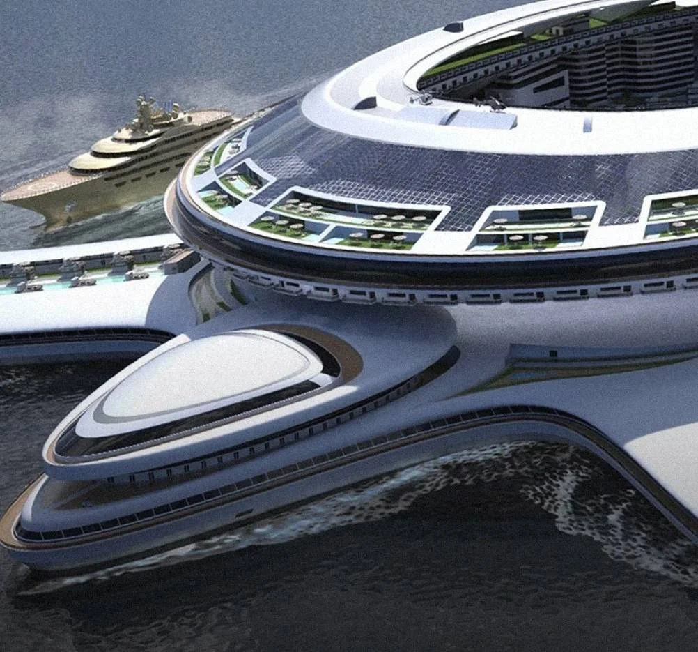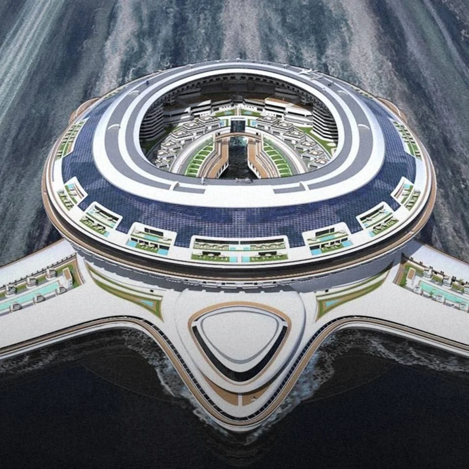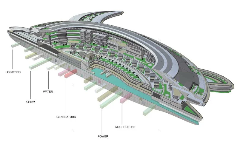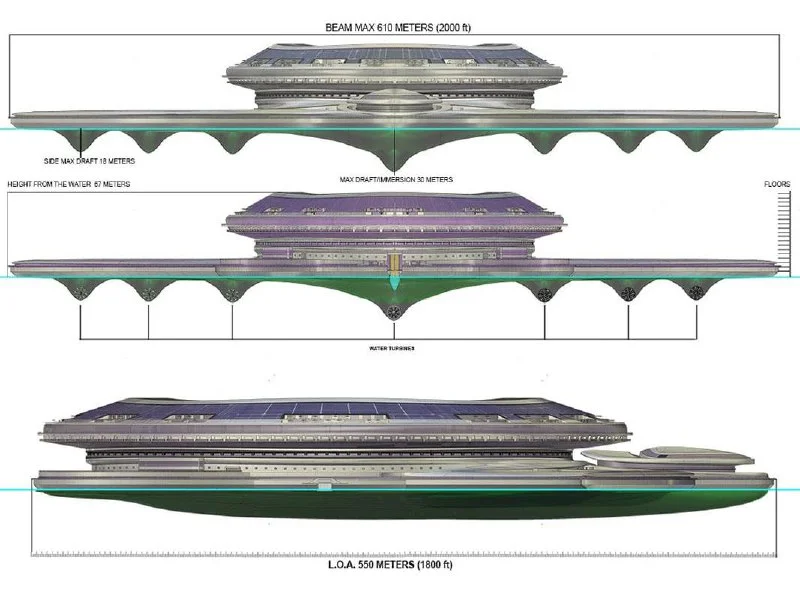 На лайнере смогут находиться до 60 тыс. гостей, а само судно будет бесконечно совершать кругосветные путешествия за счёт энергии волн и солнца.