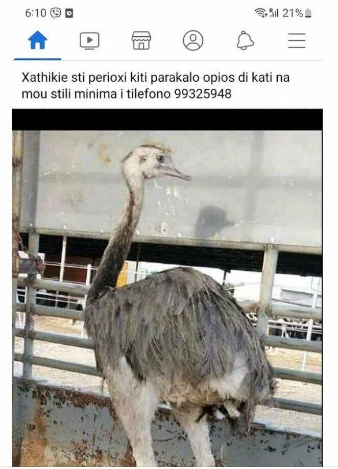 Владелец сбежавшей птицы разместил сообщение в социальных сетях. Согласно информации, страус сбежал с фермы в районе Китио в Ларнаке.
