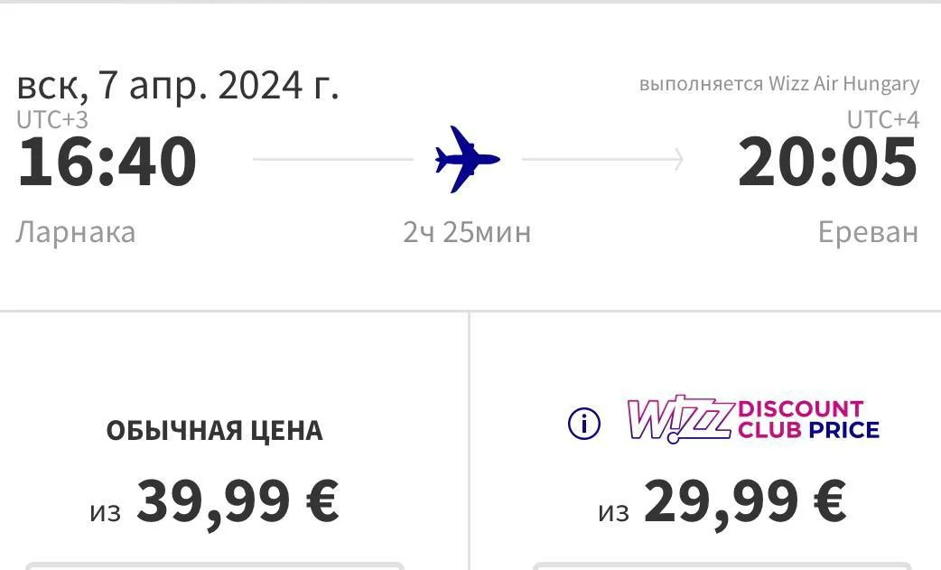 Куча дат в Армению 🇦🇲 от 40€ в одну сторону (с Wizz Air club от 30€). И даже на апрель 2024г.