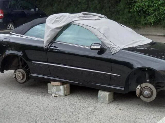 Автовладелец обнаружил пропажу всех колес своей машины рано утром. Грабители аккуратно оставили машину на кирпичах.