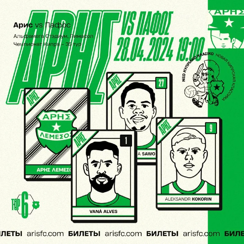 🟢х👤 «Арис» и «Пафос» сыграют в Лимасоле в ближайшее воскресенье, 28 апреля. Это трогательный момент для клуба и болельщиков — последний домашний матч сезона. И это хороший повод отправиться на стадион всей семьей и с верными друзьями!