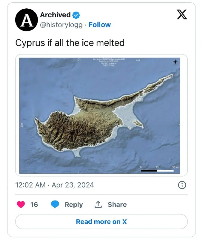 В аккаунте Archived в X (бывший Twitter) появилась карта, на которой представленКипр после возможного таяния ледников. Повышение уровня Мирового океана сказалось бы на острове Афродиты отрицательно — под водой исчезли бы немалая часть береговой линии и практически все пляжи.