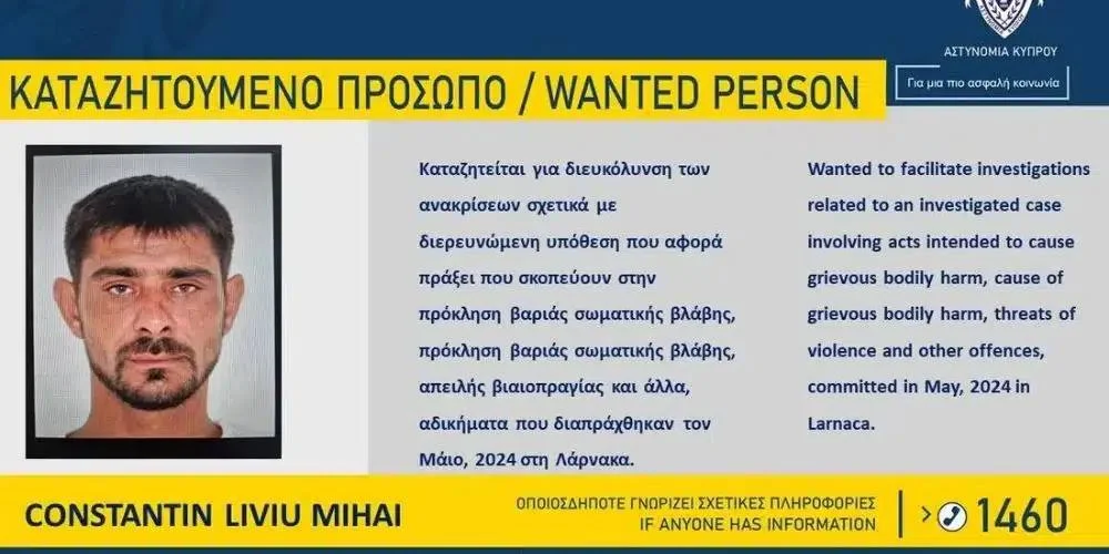 🔊 Полиция Кипра ищет 45-летнего Константина Ливиу Михая из Румынии по подозрению в угрозах насилия и причинении серьезных телесных повреждений в Ларнаке в мае прошлого года.