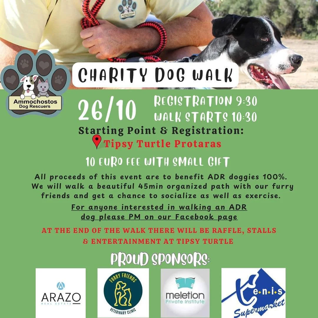 Присоединяйтесь к нам в субботу, 26 октября, в 9:30 утра у Tipsy Turtle Bar в Протарасе на замечательной благотворительной прогулке с собаками!