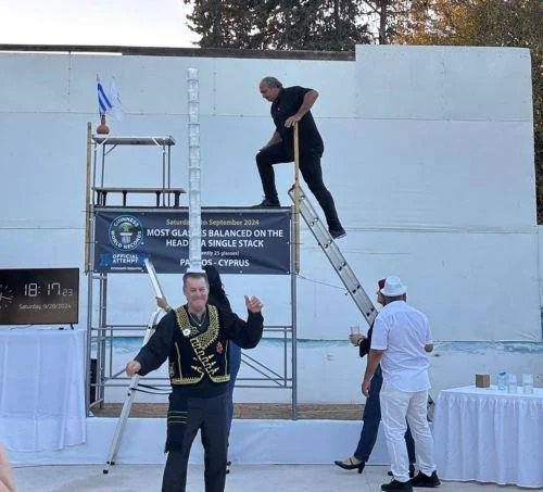 🔊 Аристотель Валаоритис из Пафоса установил новый рекорд Гиннеса, сбалансировав 28 стеклянных бокалов на голове во время традиционного кипрского танца. Это его четвертый рекорд Гиннеса в этой области.
