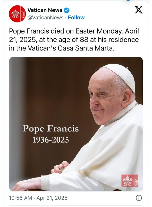 21 апреля 2025 года, в пасхальный понедельник, в своей резиденции Каса Санта-Марта скончался Папа Франциск в возрасте 88 лет.