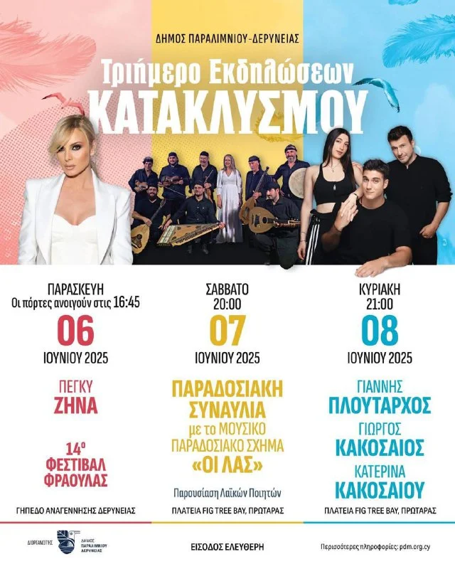 📍 Места проведения: Дериния (Фестиваль клубники) и Протарас (концерты на Fig Tree Bay).