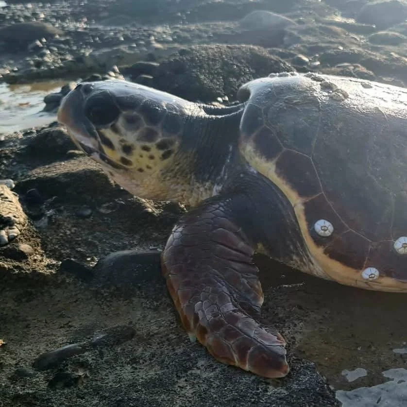 3. Застряла за скалами — Ещё одна шлемоносная черепаха застряла после гнездования. Патруль обнаружил её и безопасно отправил обратно в море.**