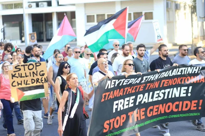 В воскресенье в Никосии прошла масштабная акция солидарности с палестинским народом. Демонстранты скандировали: «Свободу Палестине! Остановите геноцид!», неся плакаты и флаги. Многие лозунги были направлены и против британских военных баз, которые протестующие назвали «базами разрушения и смерти».