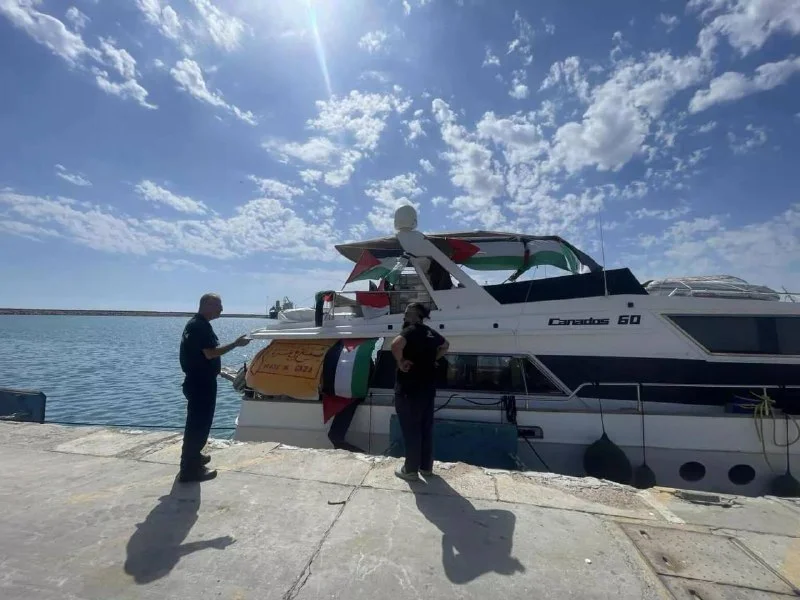 Судно под итальянским флагом «Siren», участвовавшее в флотилии, пытавшейся прорвать блокаду Газы, готовится к отплытию из порта Като Пафос. По данным администрации порта, на борту находилось восемь человек — пятеро граждан ЕС (включая британцев и ирландцев) и трое из третьих стран.