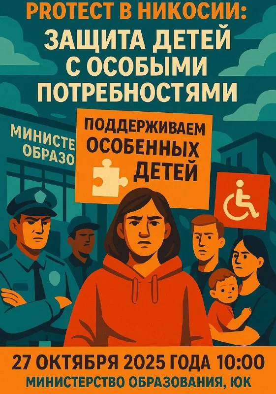 Ассоциация «Объятия надежды», Всекипрская организация слепых и Ассоциация детей с СДВГ проведут мирную акцию протеста у здания Министерства образования. Цель — привлечь внимание властей к трудностям, с которыми сталкиваются семьи и дети с ограниченными возможностями на Кипре, и потребовать равного доступа к образованию.