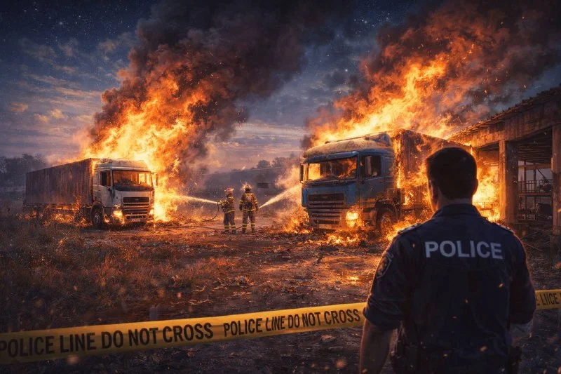 Вечером 23 декабря в деревне Алетрико, относящейся к району Ларнаки, произошёл тревожный инцидент: с разницей в короткое время загорелись два припаркованных грузовика. Пожары вспыхнули между 19:00 и 20:00 — один автомобиль находился на открытом поле, второй — в заброшенном животноводческом помещении.