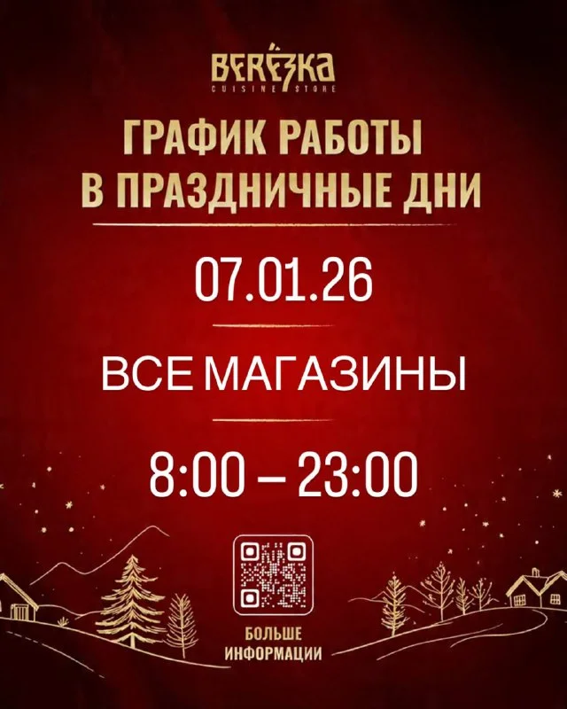 Все 14 магазинов Berezka Store & Cuisine работают сегодня по обычному графику с 8:00 до 23:00