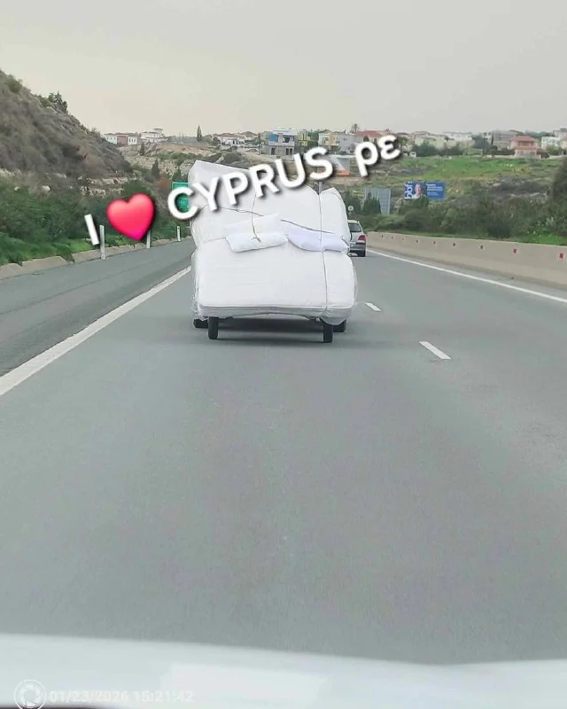 На одном из шоссе Кипра водители стали свидетелями необычной картины: легковой автомобиль перевозил огромный матрас, закреплённый с явными нарушениями. Со стороны это выглядит почти комично — будто машина «надела пуховик». Но на деле ситуация была потенциально аварийной.