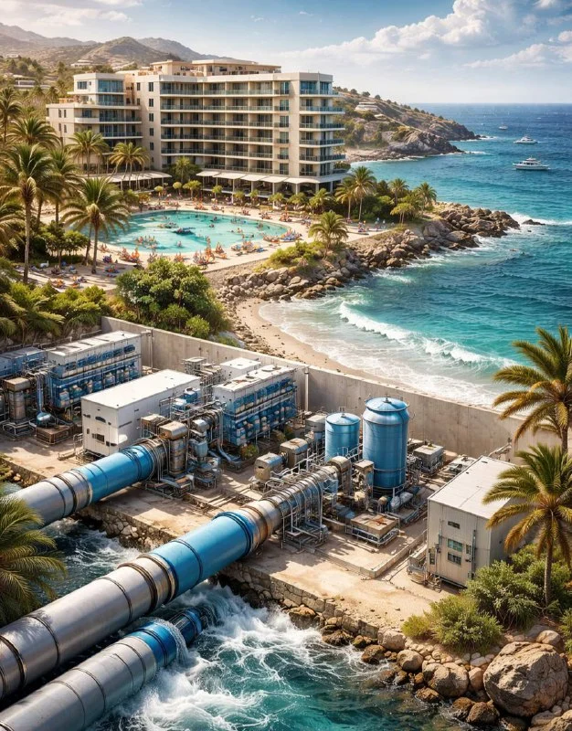 На Кипре большая проблема с водой. Дождей мало, плотины заполнены всего на 17,6%, а спрос на воду растёт с каждым годом. Поэтому правительство решило: пусть отели и крупные комплексы сами добывают себе воду из моря. Это называется децентрализация — чтобы не нагружать центральные сети, особенно летом, когда туристов много.