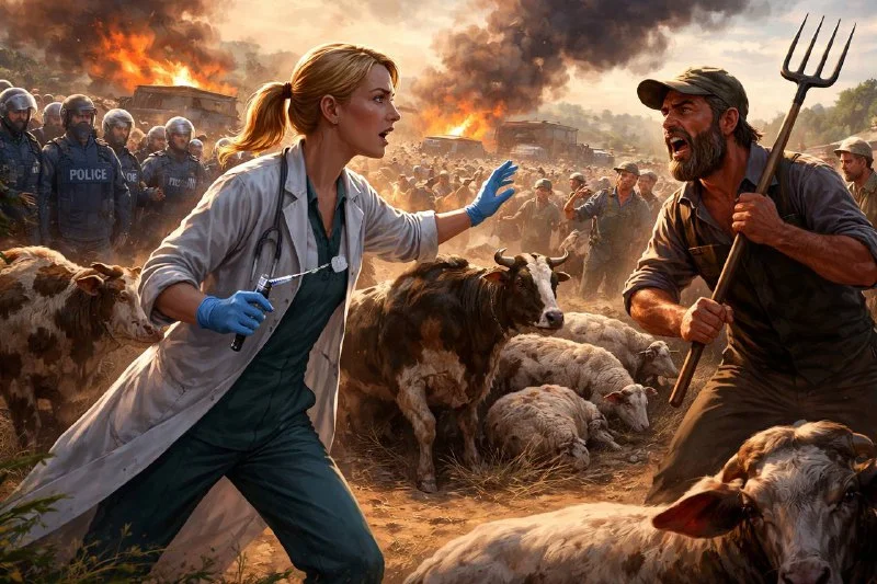 Тем временем в Ороклини фермеры заблокировали подъезды к хозяйству коллеги, выставив гроб на крыше машины. Под проливным дождём они заявили: ветслужбы не войдут. На месте — усиленные наряды полиции, но пока без столкновений.