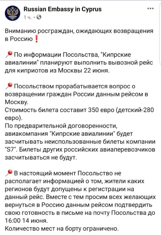 Доброе утро! В группе "Кипр новости" информация о рейсе 22 июня, Ларнака - Москва - Ларнака, если Вам ещё аткуально))