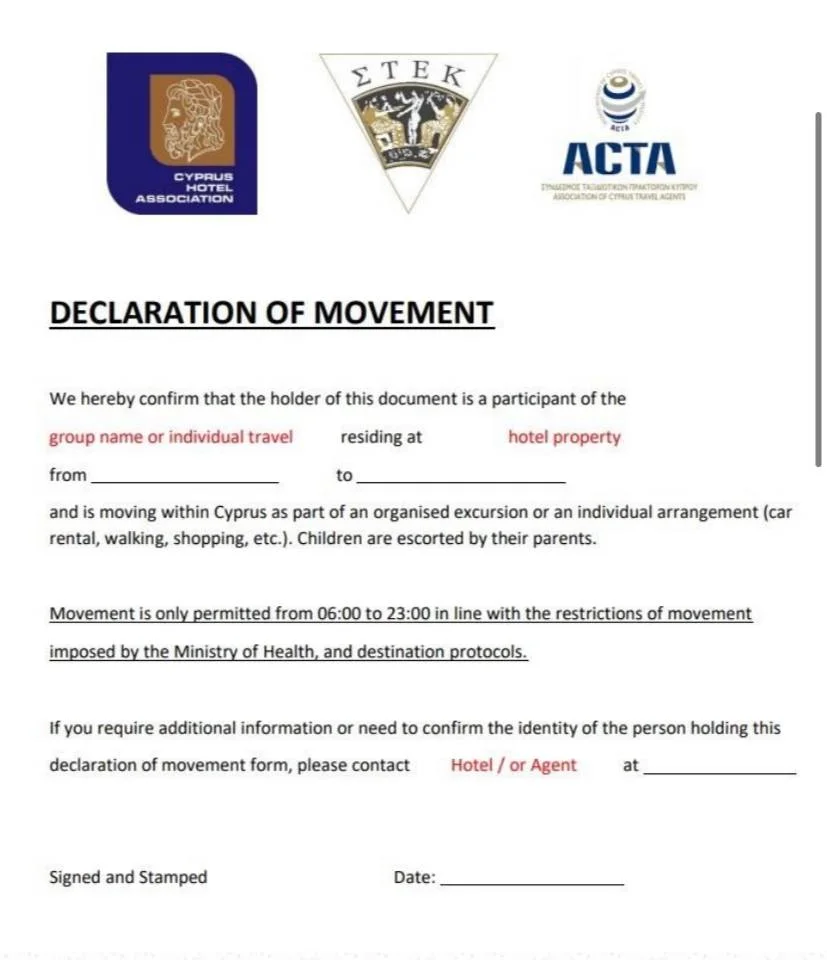 Подминистерство туризма утвердило документ, который позволяет туристам, прилетевшим на Кипр, передвигаться по стране без необходимости отправлять смс. Туристы могут получить бумагу у своего туристического агента или в гостинице, где они остановились. Перемещения по острову разрешены с 06:00 до 23:00 без каких-либо ограничений.