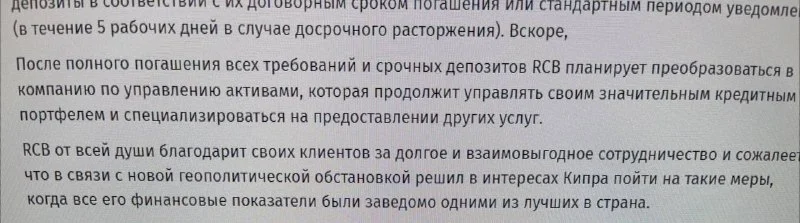 Не могу, вчера письмо клиентам пришло, вот отрывок. • You can no longer deposit or send funds to your account with RCB Bank. This applies also to cash and cheques deposits.