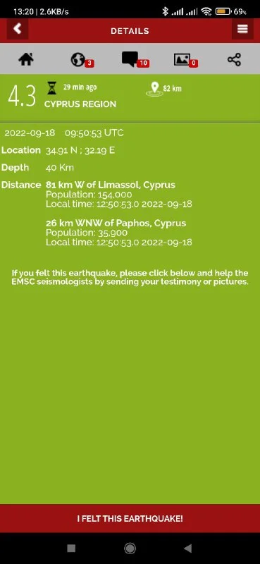 В 12:50 воскресенья, 18 сентября, у западных берегов Кипра произошло землетрясение магнитудой 4,3 (в первом сообщении речь шла о 3,7). По данным Евро-Средиземноморского сейсмологического центра, гипоцентр находился в 26 км к северо-западу от Пафоса между мысом Арнаутис и заливом Лара на глубине 40 км. По данным Cyprus Times, землетрясение ощутили лишь некоторые жители высотных зданий. Напомним, что землетрясение с такой же магнитудой случилось у берегов Пафоса 30 августа.