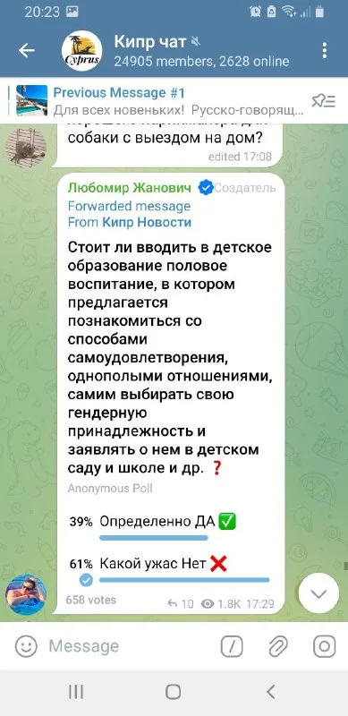 60/40 страшная статистика. 40% по опросу пока За извращения над детьми. И это русскоговорящий чат Кипра. Что происходит на свете?🤧