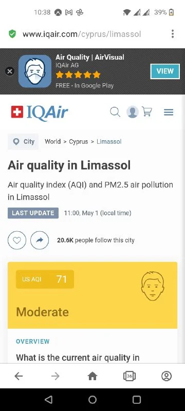 Сломалась станция измерения в Лимассоле, уже 3й день. Неправильная инфа выдаётся на все сайты международные (показывается aqi около нуля), местные просто прочерк ставят