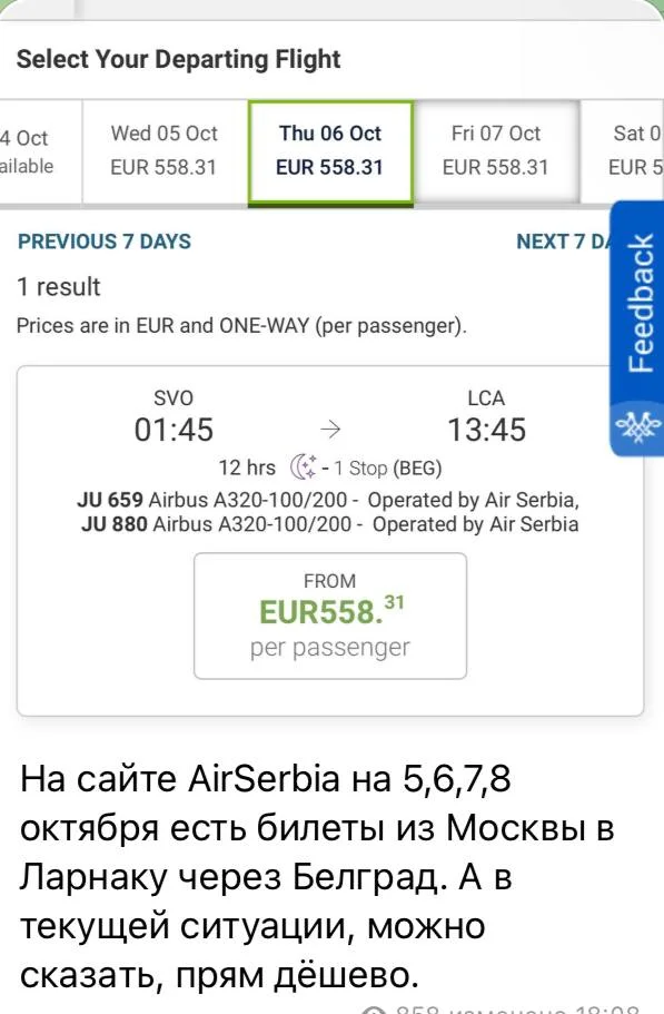 Нависайте AirSerbia на 5,6,7,8 октября есть билеты из Москвы в Ларнака через Белград. А в текущей си...