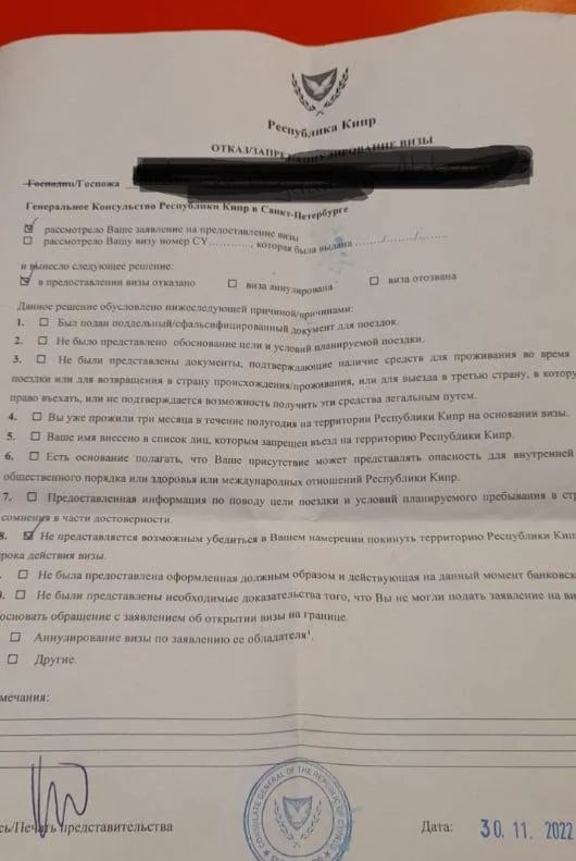 Из 50 россиян, пришедших 6 декабря в Генконсульство Республики Кипр в Санкт-Петербурге за визами, 48 получили отказ. Причина одинакова: «Не представляется возможным убедиться в Вашем намерении покинуть территорию Республики Кипр в течение срока действия визы».