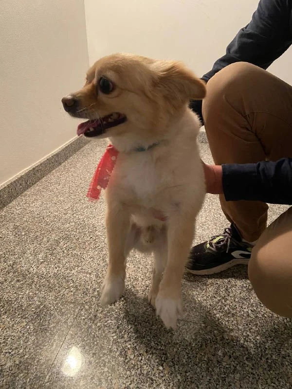 Бежевый, кг 5 на вид, с красной ленточкой на голубом ошейнике. Хозяева, найдитесь!