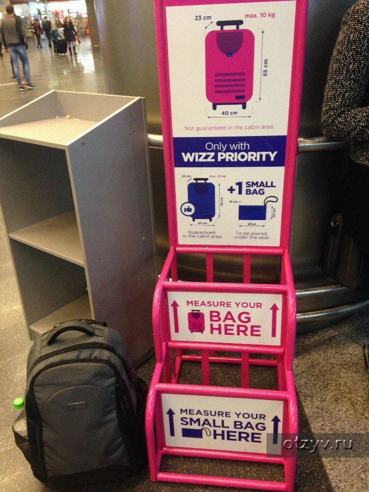 Здравствуйте. Wizzair указывает в ручную кладь рюкзак + чемодан 40×30×20. Кто-то может сталкивался, если чемодан чуть больше по размеру (на пару-тройку см,) не пропустят, как ручную кладь?