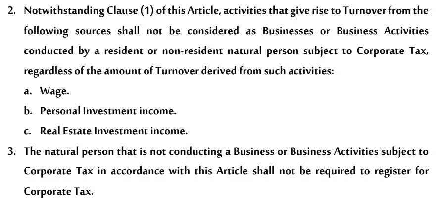 In the case where several Businesses or Business Activities are conducted by one natural person, the aggregate of all Businesses and Business Activities will be considered when determining whether it exceeds the AED 1 million annual Turnover threshold.