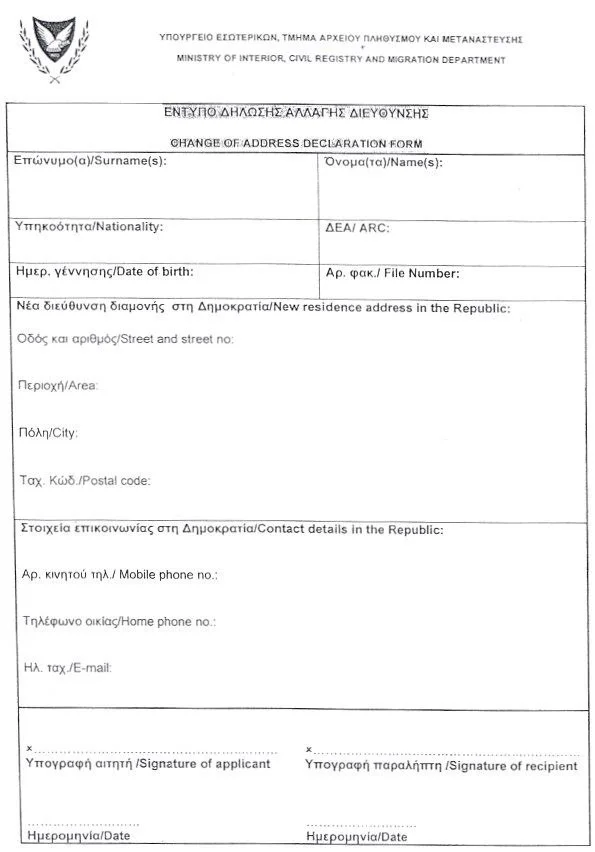 Declaration of change address вам нужен, но я его на сайте не нашёл, там была только форма первоначальной регистрации