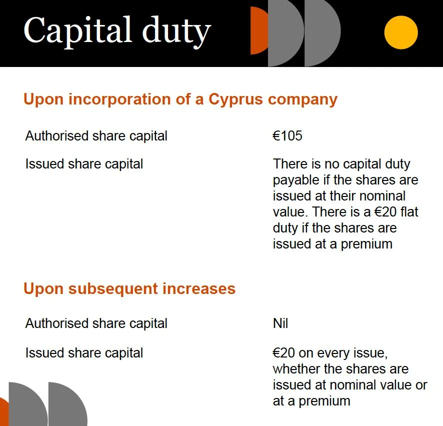 Общее правило заключается в том, что гербовый сбор Кипра взимается только с письменных документов, касающихся активов, находящихся на Кипре, или вопросов, которые будут иметь место на Кипре. Применимые ставки основаны на стоимости, указанной в каждом инструменте, и равны нулю для сумм до 5 000 евро, 0,15% для сумм от 5 001 до 170 000 евро и 0,2% для сумм выше 170 000 евро, при условии, что общая максимальная сумма составляет гербовый сбор в размере 20 000 евро. Освобождение от гербового сбора применяется в случае соответствующей схемы реорганизации.