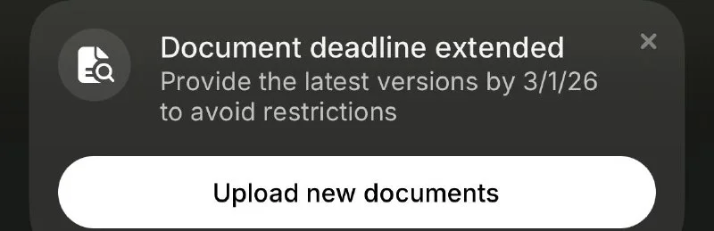 Присоединяюсь. У меня и вовсе при нажатии “I have documents” появляется окно restriction.