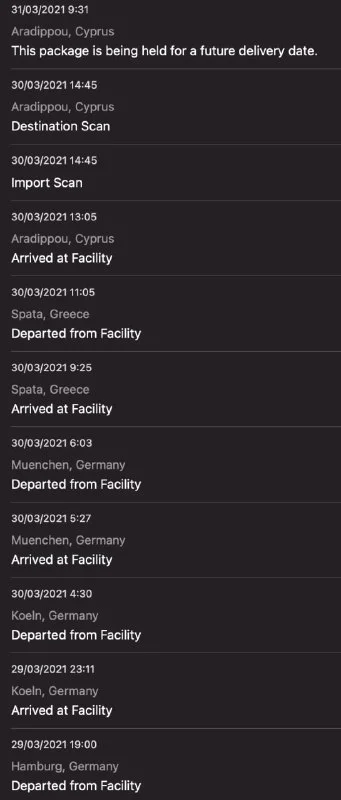 вот в этом случае посылка уже со вчерашнего дня в Лимасоле, хотя по треку в Арадипу