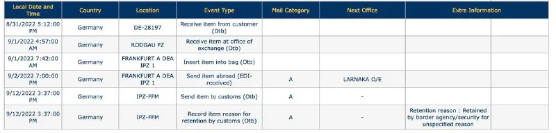 Десять дней назад "отправлено в сторону Кипра", а сегодня отметилось все еще на немецкой таможне 😟