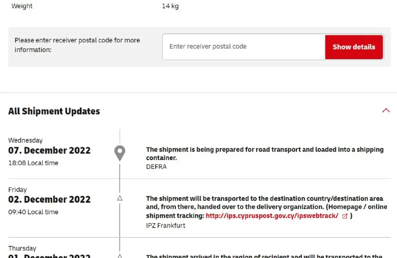 12/5/2022 10:00:00 AM Germany FRANKFURT A DEA IPZ 1 Send item abroad (EDI-received) Next Office: LARNAKA O/E