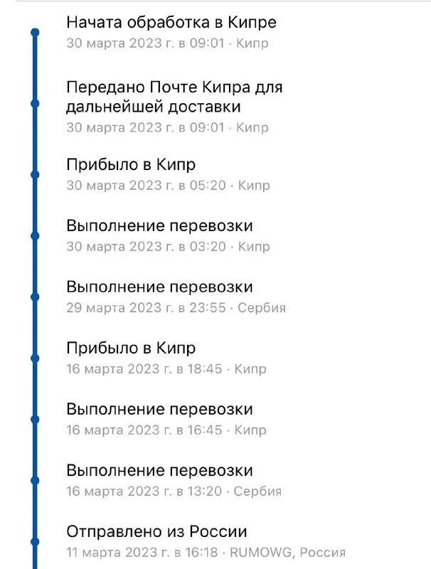 Присоединюсь к отслеживанию ситуации(( У меня тоже 2 посылки с личными вещами по статусам от почты россии 16го прибыли на Кипр, а тут тишина. Правда что странно одна успела снова в Сербию слетать и якобы начата обработка. А по информации кипрской почты их тут еще нет..