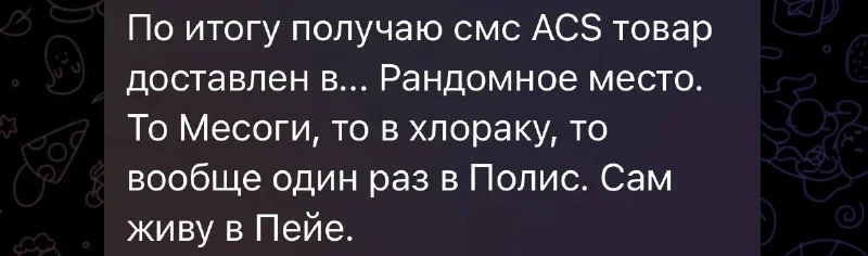 По итогу получаю смс ACS товар доставлен в... Рандомное место. То Месоги, то в хлораку, то вообще один раз в Полис. Сам живу в Пейе.